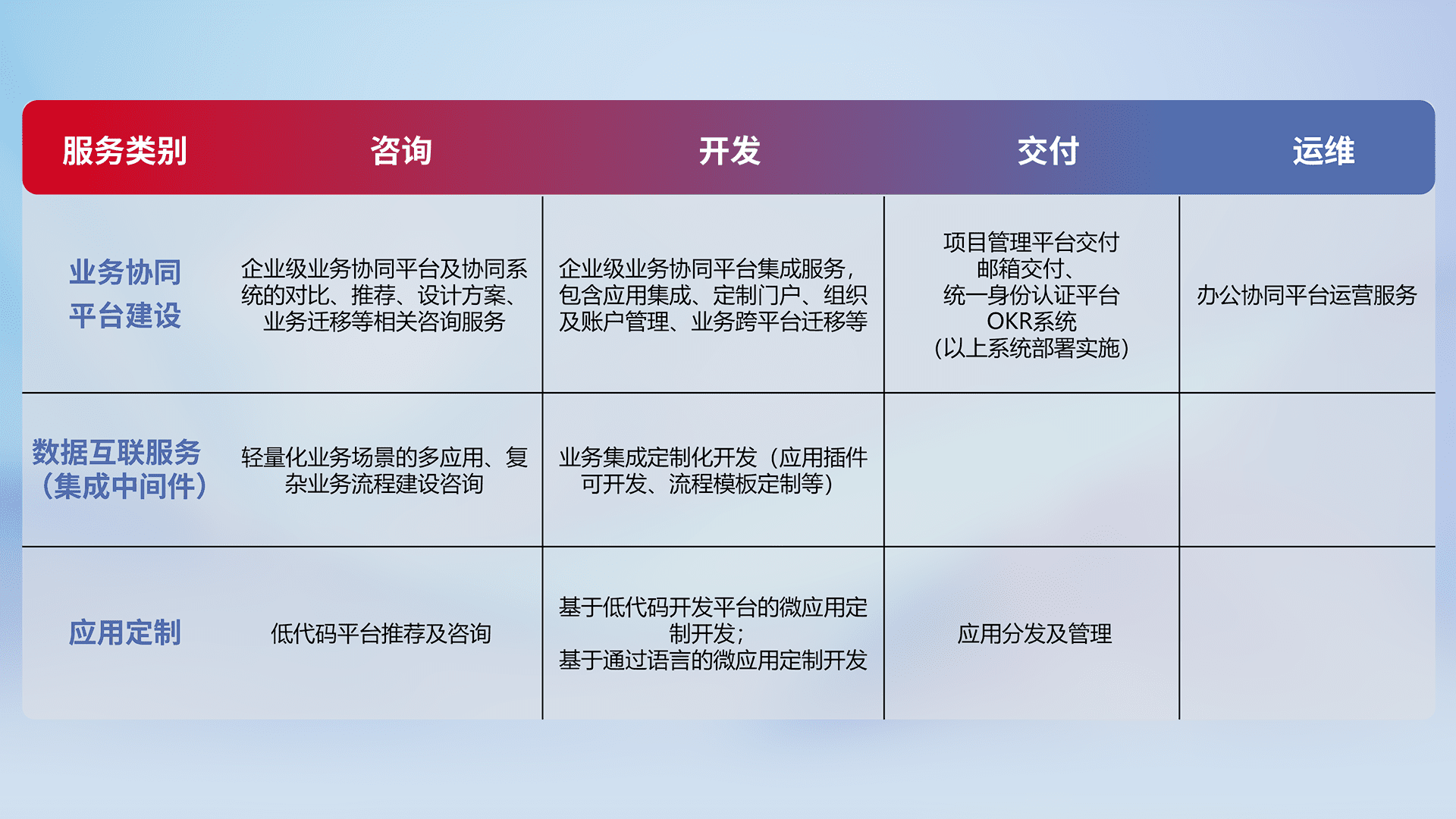 针对钉钉、、、企微、、IDaas等平台级产品提供产品的规划、、、、方案、、交付、、定制化开发等服务,,,实现如统一协同办公、、智能客户服务、、、、混合会议管理、、智能数据查询、、等业务场景,,实现数字化转型。。。